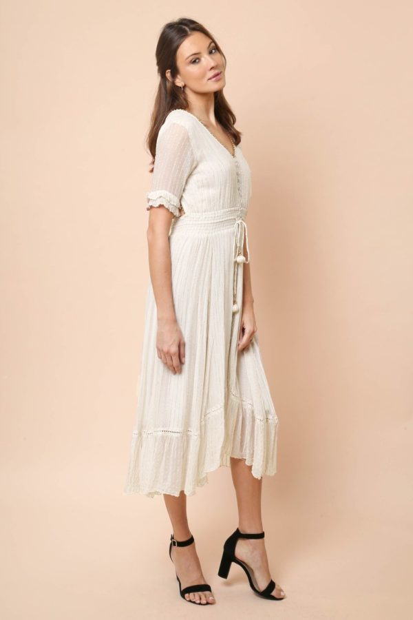 La couture en smock (nid d’abeille) élastique maintien la taille avec des attaches ornées de boules brodées de perles fait à la main.